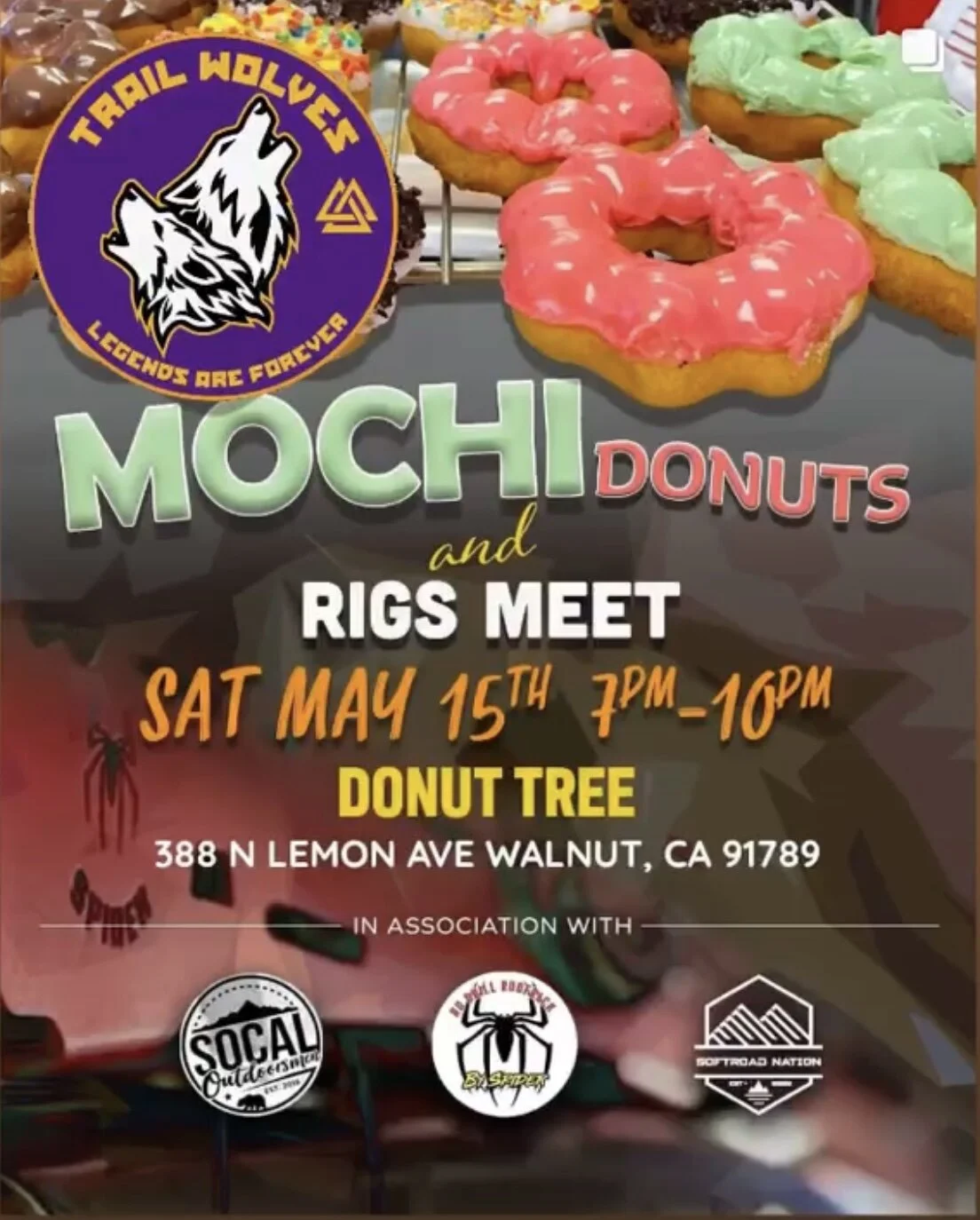Mochi and Rigs Saturday, May 15, 2021 7:00 PM 10:00 PM Mochi Doughnuts 388 North Lemon Avenue Walnut, CA, 91789 United States (map) Google Calendar ICS