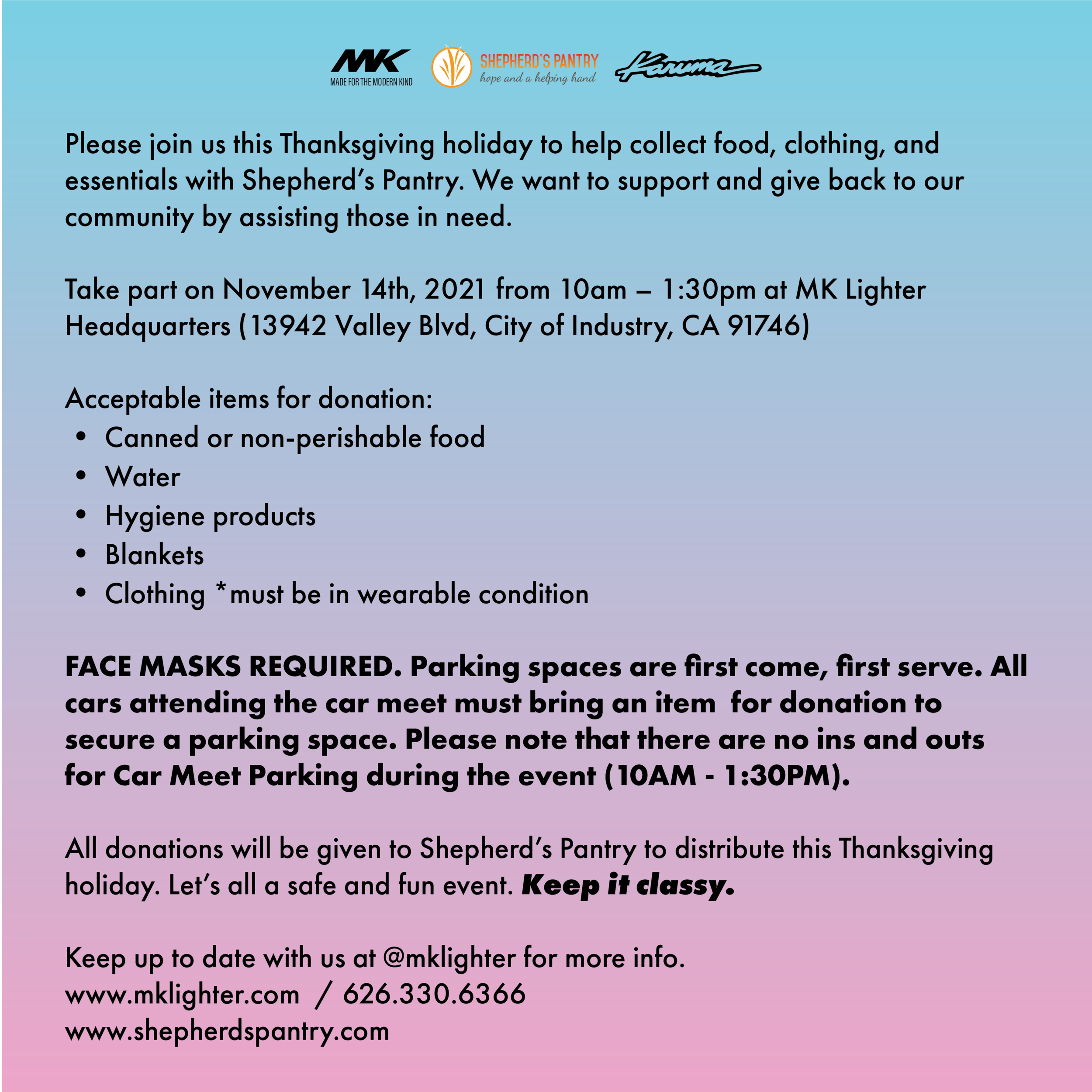 Thanksgiving Food and Clothing Drive Sunday, November 14, 2021 10:00 AM 1:30 PM MK 139242 e valley Blvd City of industry United States (map) Google Calendar ICS